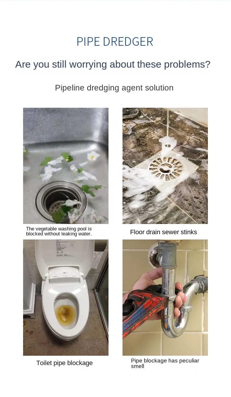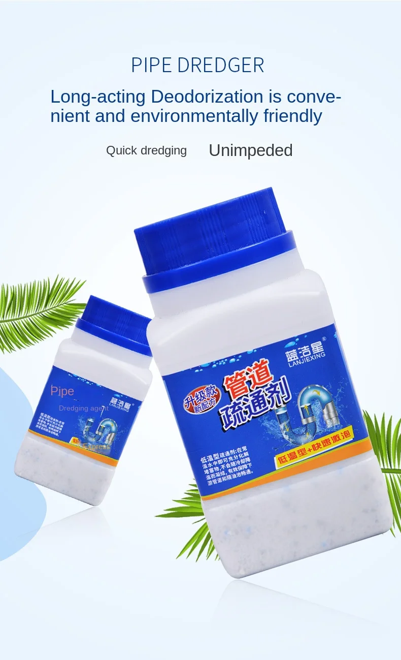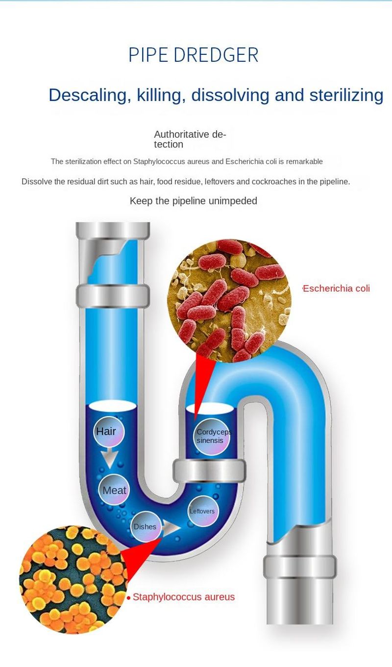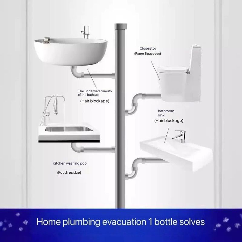 4. Applications: Deodorizer and cleaner for household drains including kitchen sinks, vanity sinks, bathtubs, showers, drainpipes, bathroom pipes, floor drains, grease buildup, and other drainage systems.
