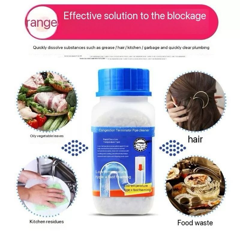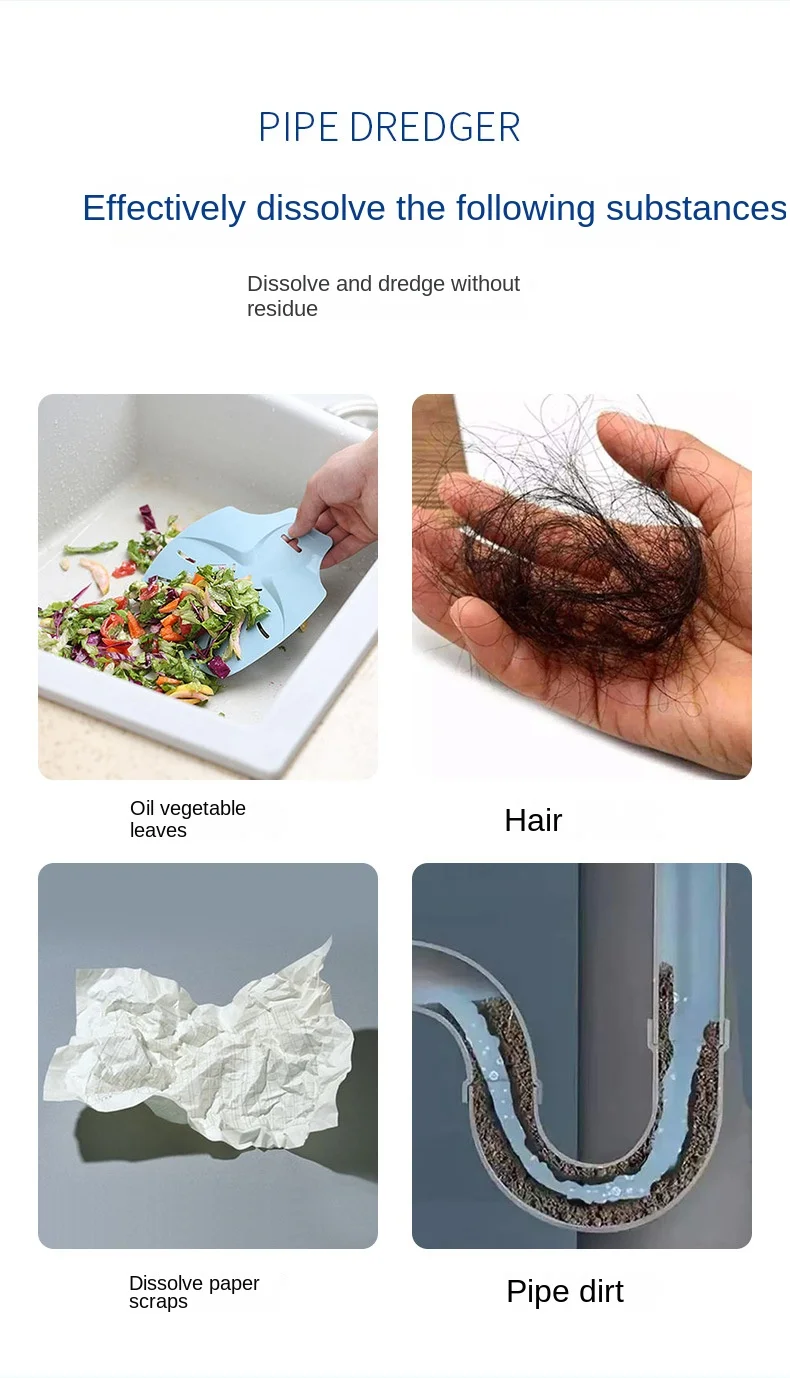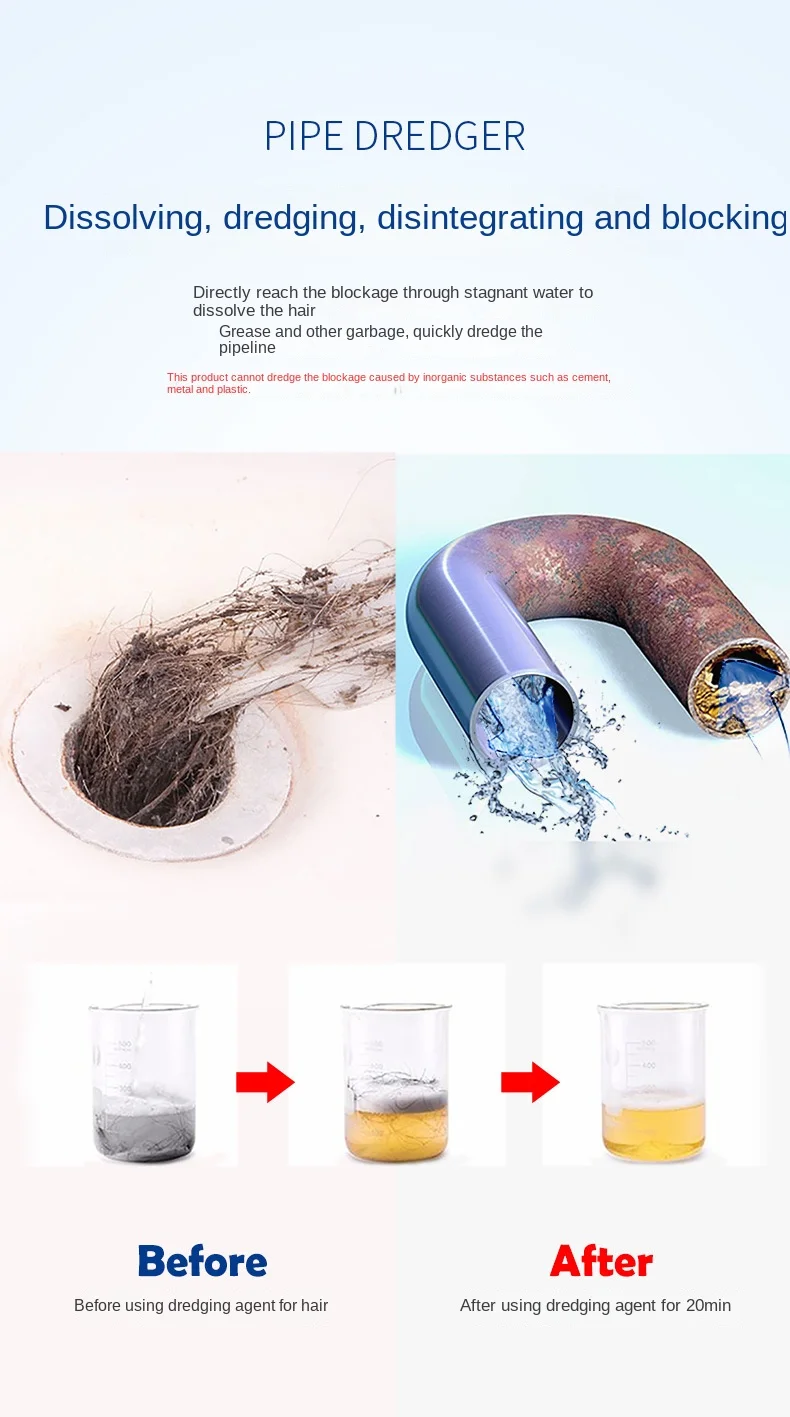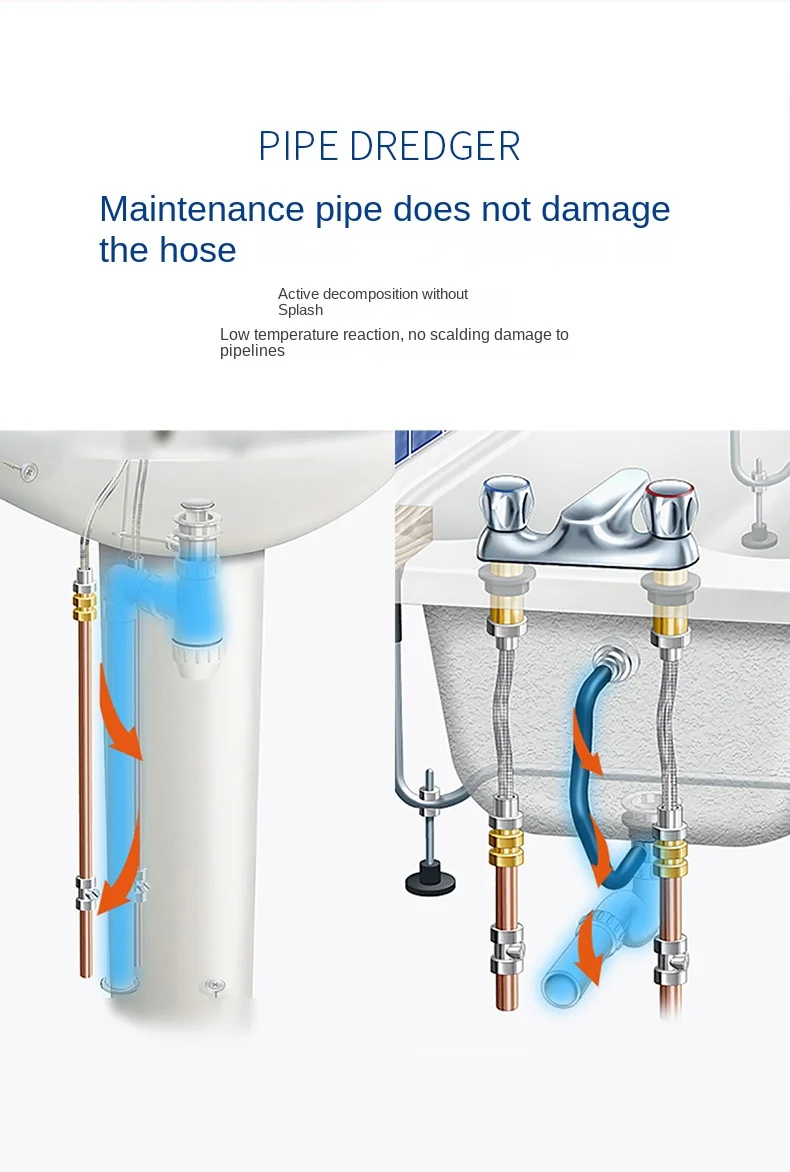 3. How It Works: The appropriate amount of pipe drain cleaner powder creates abundant foam in water. The chemical reaction breaks down clogs. This sink and drain cleaner easily dissolves grease, hair, paper, soap scum, oil, and organic matter through low-temperature reaction and rapid foaming.